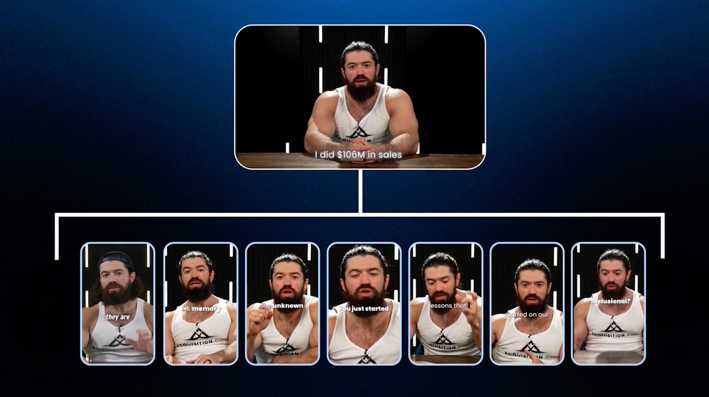 Luke Belmar took the same mechanic and internalized it. Between 400 and 600 videos produced daily. 250 to 400 million views per month. $100K monthly burn. This is not content. It is content infrastructure.